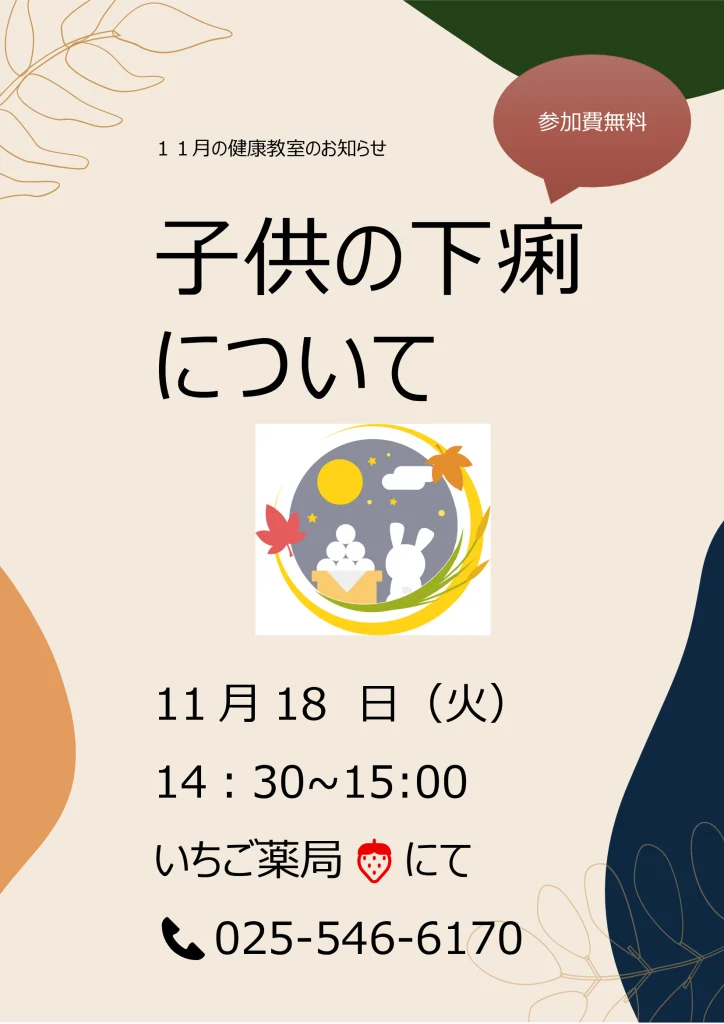 いちご薬局下門前(上越市下門前)では、11月18日に健康教室「子供の下痢について」を実施いたします。